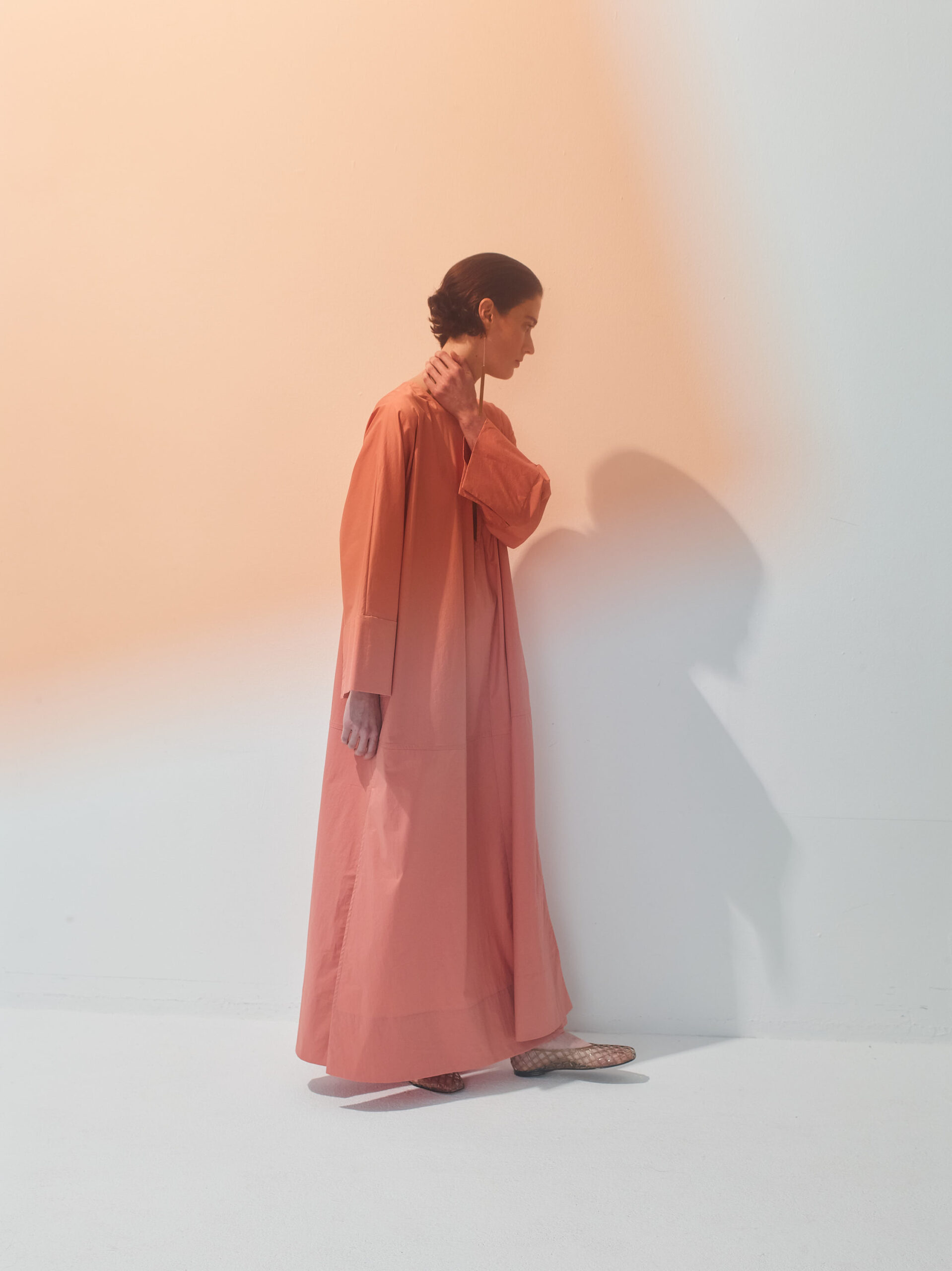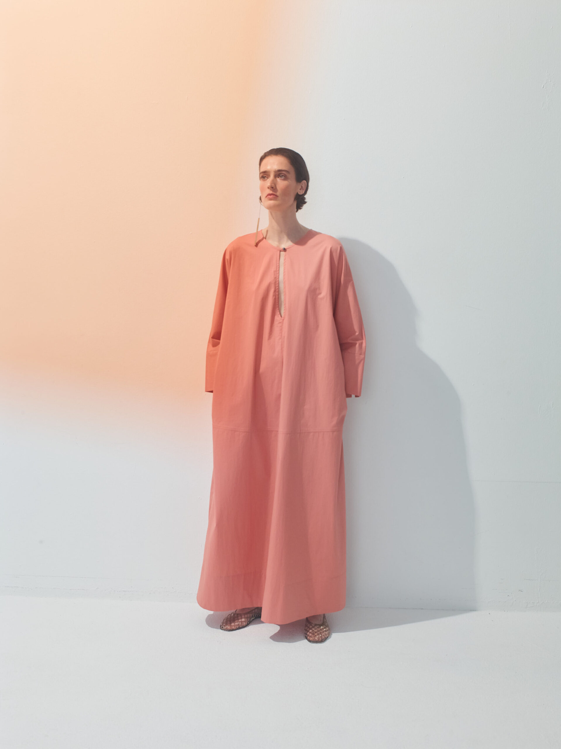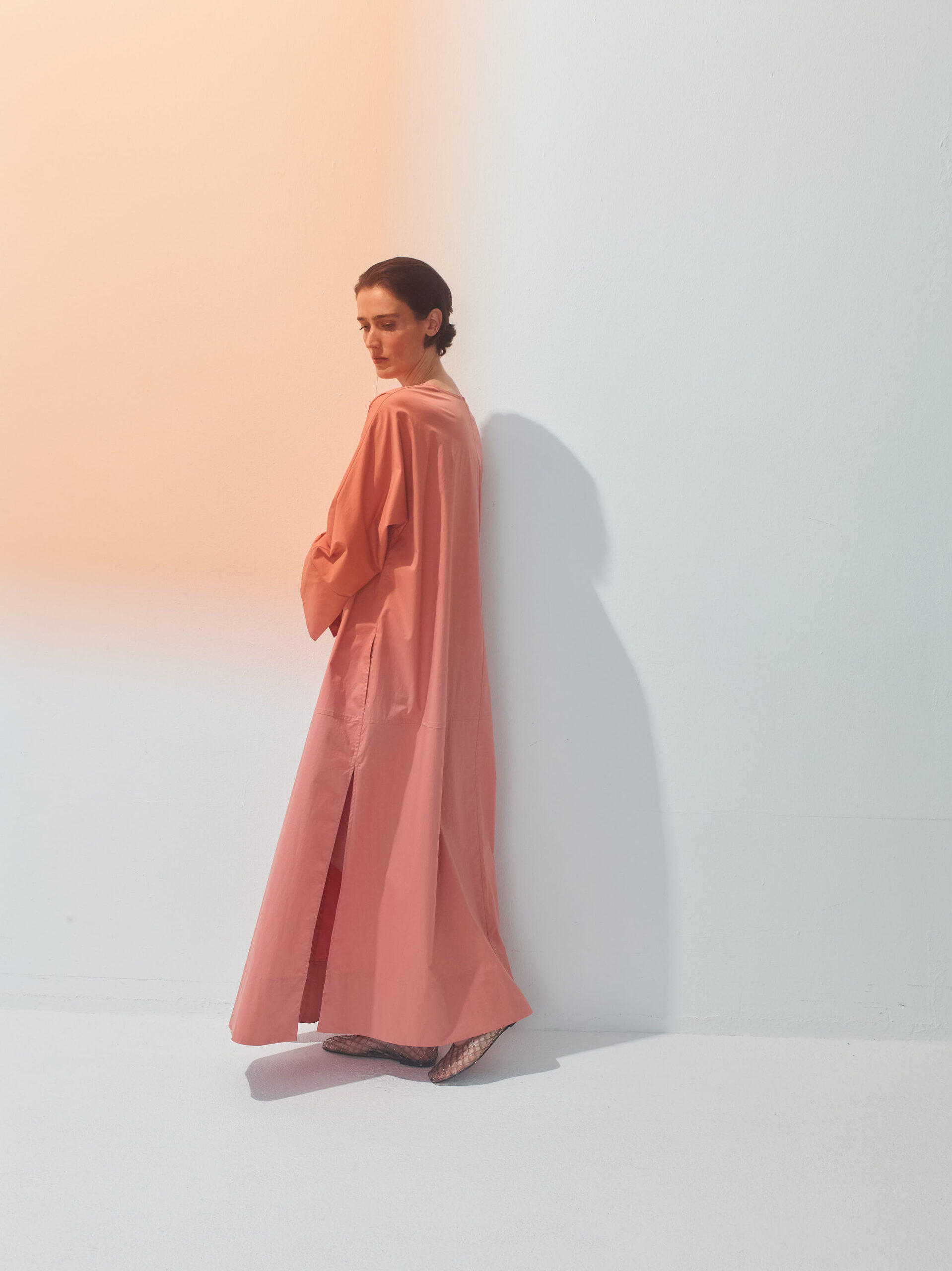 Ankle-length kaftan with wide long sleeves.