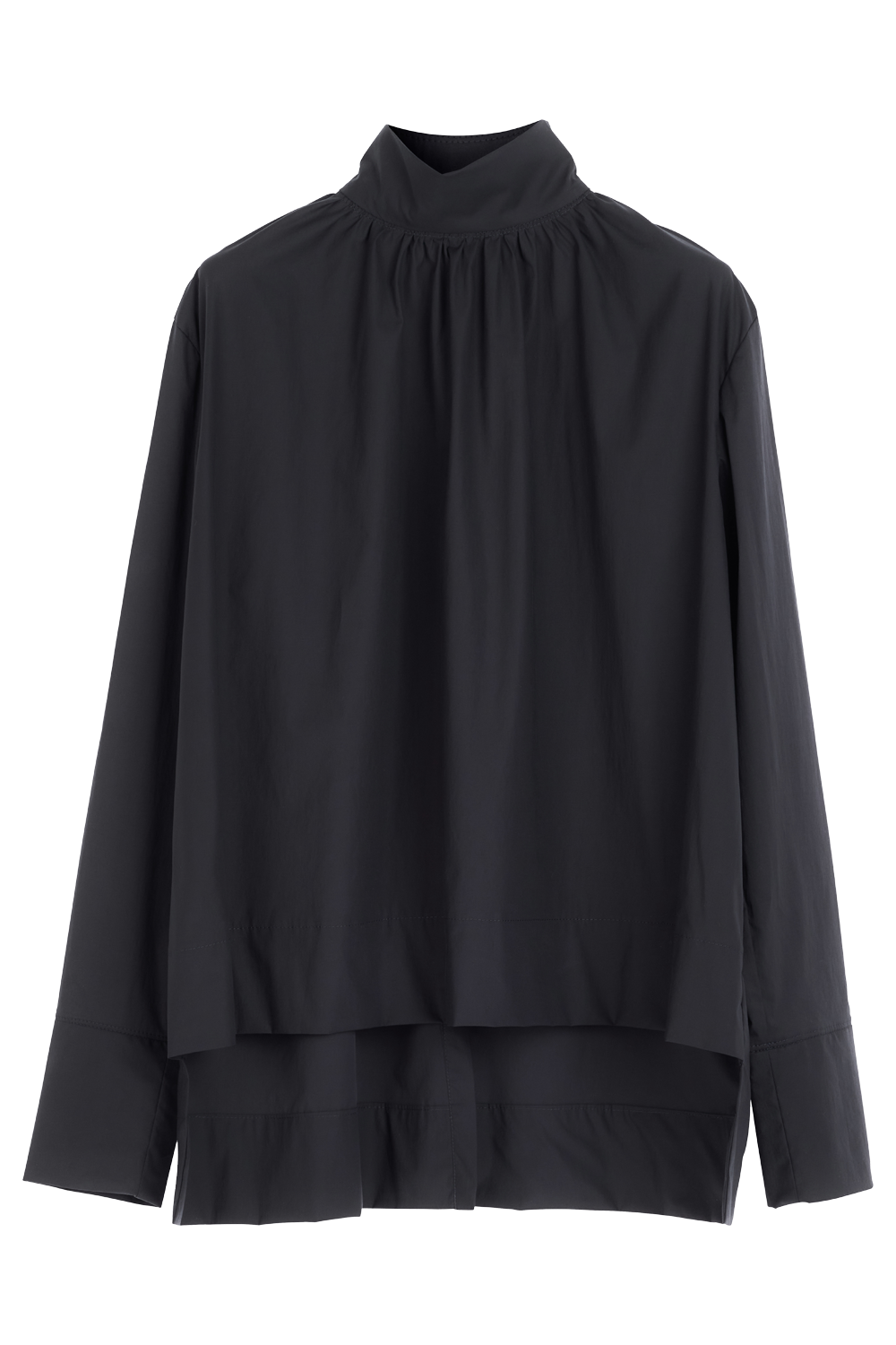 This relaxed shirt features an oversized fit in a timeless menswear design, offering a modern and laid-back look. The curved hem creates a flowing silhouette, while the large patch pocket on the chest adds practical functionality. A distinctive detail is the contrasting black loop at the back, giving the shirt an individual touch. Styled here with the wide-cut ILA TROUSERS and the JOAN TRIANGLE worn as a belt.
